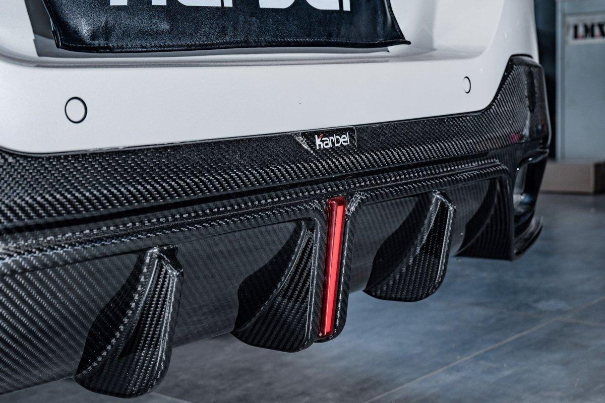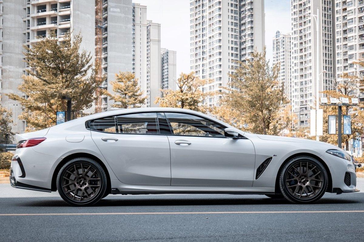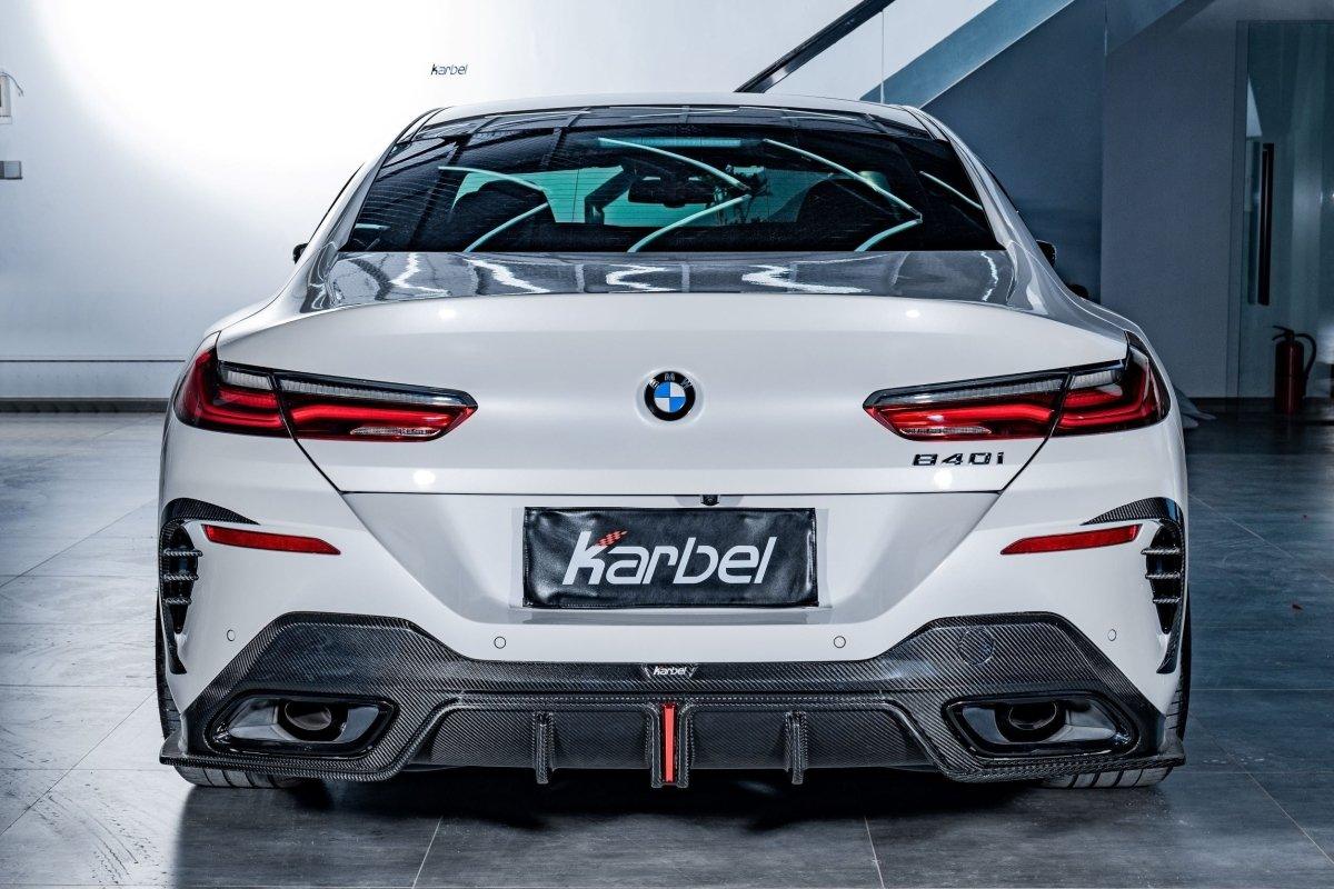 Featuring the thinnest headlight design ever seen on a BMW gives plenty of presence. Karbel developed an exclusively massive diffuser with couple of fins on for 8 Series grand coupe, carbon front splitter makes car wider and lower.