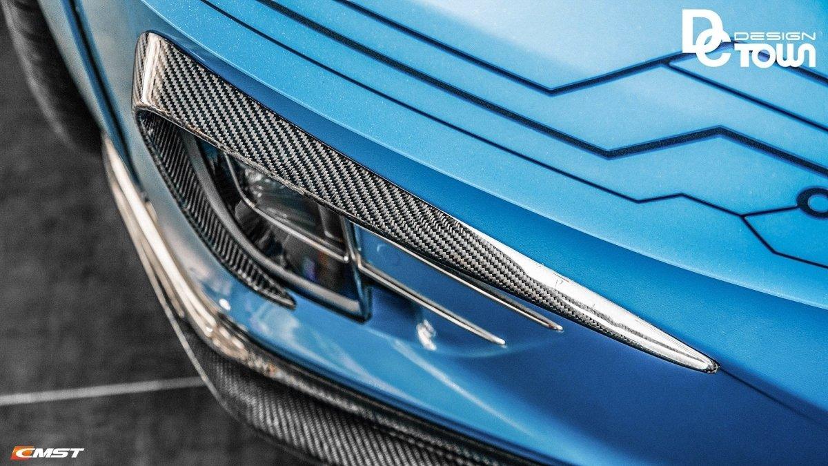 CMST Tuning uses Grade A one-piece carbon fiber sheets with a Fiberglass Reinforced Plastic (FRP) skeleton for strength and durability (except on dry carbon products, since it is not needed). Because CMST Tuning uses one-piece sheets, so you will not see any broken lines or patterns. Rather, all you will notice is just one big consistent weave pattern. In addition to this, all CMST Tuning products use a strong clear coat finish. Clear coats are shiny and durable, and they give you the nice "wet" look as opposed to a duller look from gel coats. Lastly, all of CMST Tuning's carbon sheets are built into the mold, so they do not break and split like the ones where carbon is only wrapped around the skeleton.