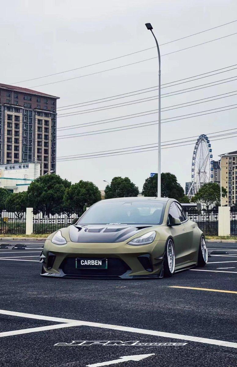 Upgrade Your Tesla Model 3 Performance Long Range Standard Base 2017 2018 2019 2020 2021 2022 2023 with Aftermarket Parts - "HACKER" Widebody Front Bumper & Front Splitter Carbon Fiber / FRP from Robot Craftsman