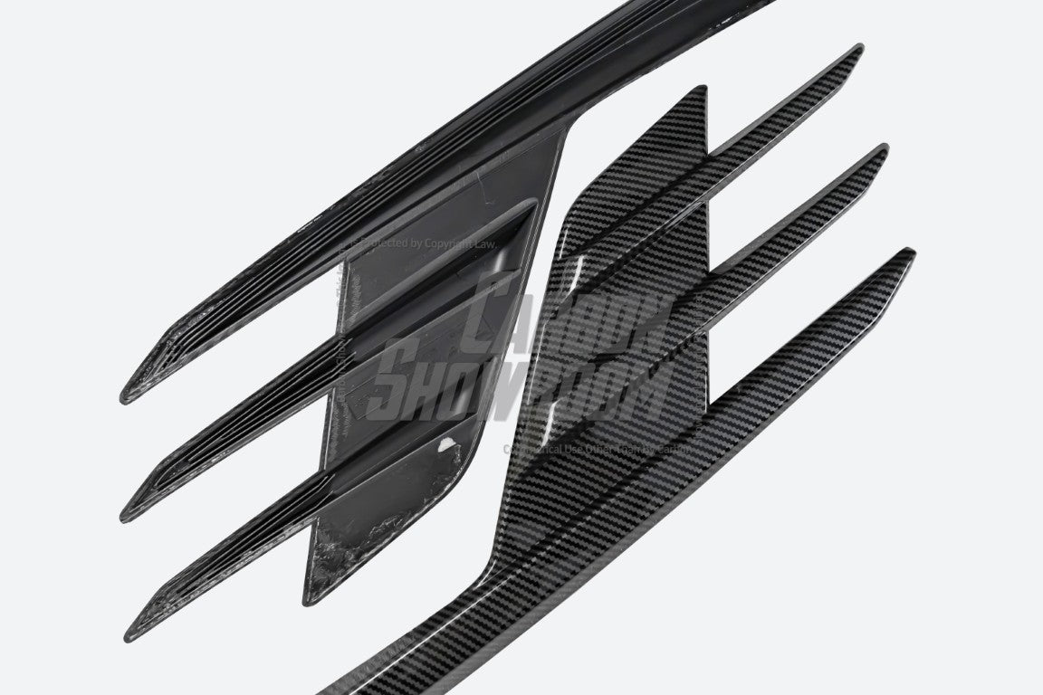 FRP is NOT Carbon Fiber and is a composite material of carbon polymers and fiberglass. Coming in a fresh sanded and primed finish, FRP is ready for paint or wrap! Carbon Fiber, depending on the brand and part, can be offered in Pre-Preg or Vacuum Carbon. Carbon Fiber is a woven pattern of carbon fibers, standard in a 3k weave.