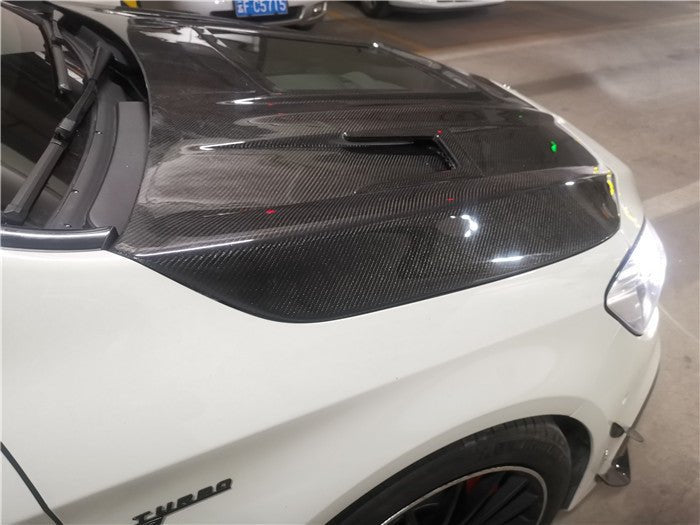 FRP is NOT Carbon Fiber and is a composite material of carbon polymers and fiberglass. Coming in a fresh sanded and primed finish, FRP is ready for paint or wrap! Carbon Fiber, depending on the brand and part, can be offered in Pre-Preg or Vacuum Carbon. Carbon Fiber is a woven pattern of carbon fibers, standard in a 3k weave.