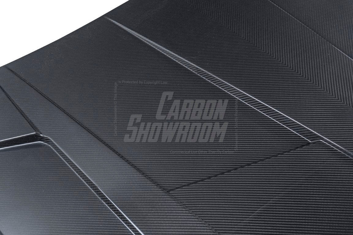 FRP is NOT Carbon Fiber and is a composite material of carbon polymers and fiberglass. Coming in a fresh sanded and primed finish, FRP is ready for paint or wrap! Carbon Fiber, depending on the brand and part, can be offered in Pre-Preg or Vacuum Carbon. Carbon Fiber is a woven pattern of carbon fibers, standard in a 3k weave.