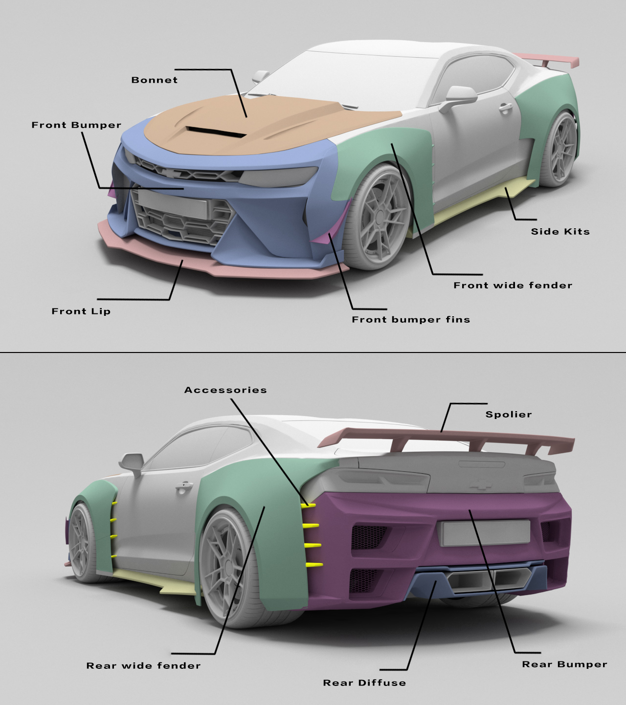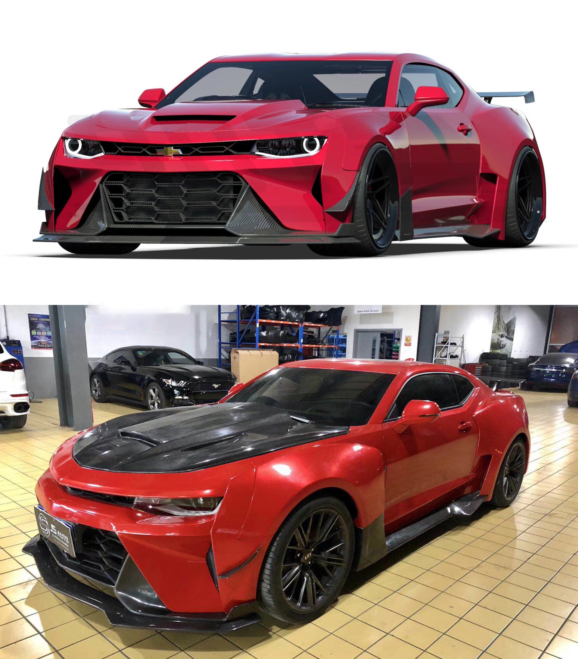 Upgrade Your Chevrolet Camaro 6th Gen ZL1 Z/28 2SS 1SS 3LT 2LT 1LT 2LS 1LS 2015 2016 2017 2018 2019 2020 2021 2022 2023 2024 with Aftermarket Parts - Front Bumper & Lip Carbon Fiber/FRP from SPECTER PLUS
